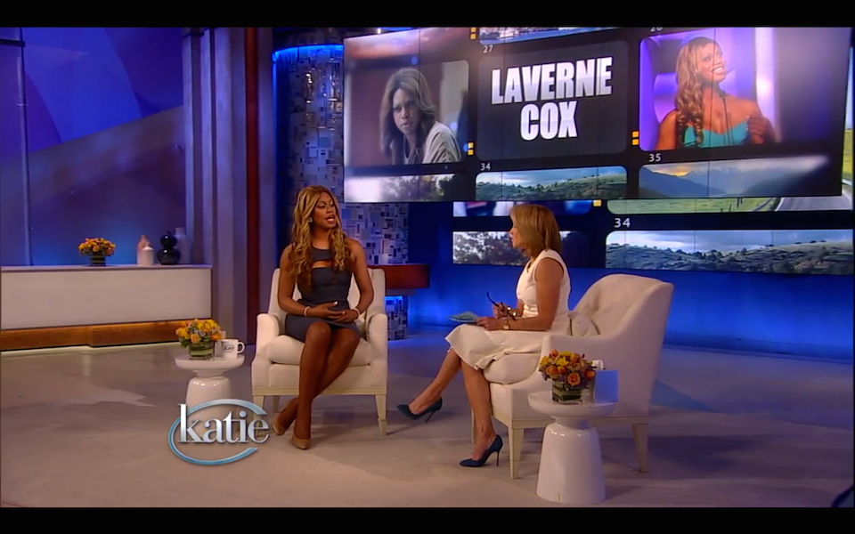 Today Orange is the New Black star and transgender activist Laverne Cox returned to Katie, the daytime talk show hosted by Katie Couric, for the first time since her infamous January appearance where she and transgender model and activist Carmen Carrera had to put up with a barrage of questions about what surgeries they had had and what their genitals were like. Cox and Carrera were able to turn the conversation around and the whole thing turned into a lesson on how to not interview trans women. This time, Couric had already been through a teachable moment about how to talk to trans women, but as we’ve seen before, not everyone learns their lesson.